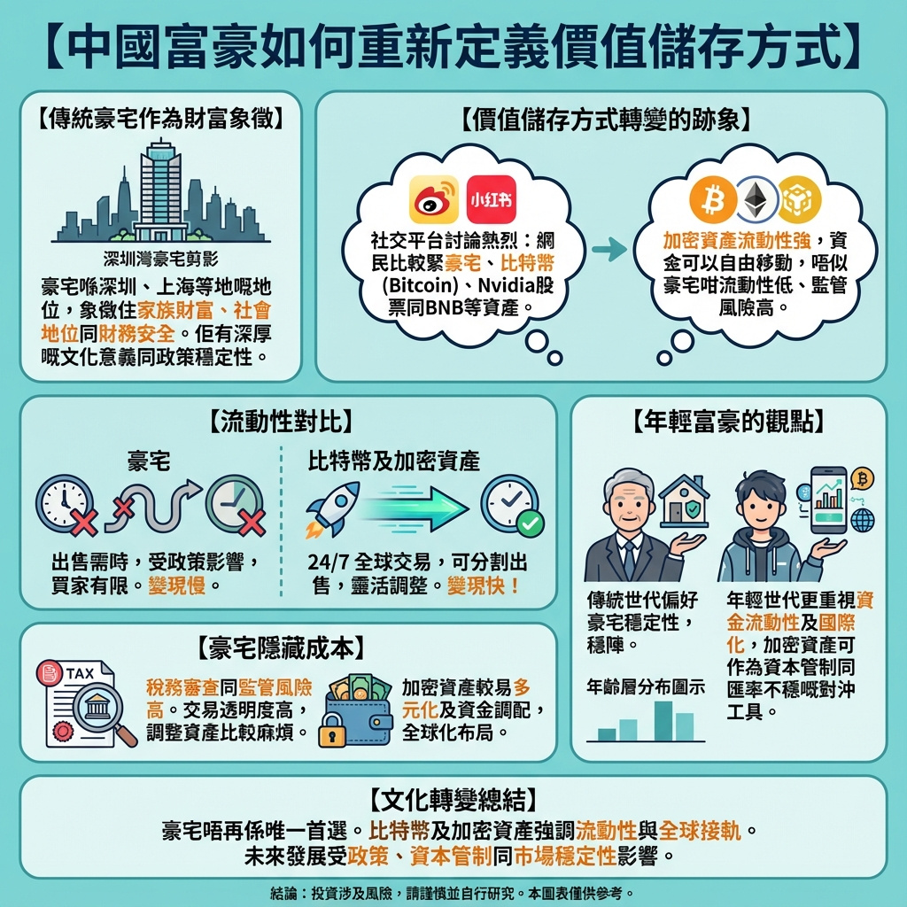 中國社交媒體上的討論顯示,這不是統一的投資策略,而是心態的轉變。比特幣與豪宅的比較,反映了社會優先次序和市場動態的演變。