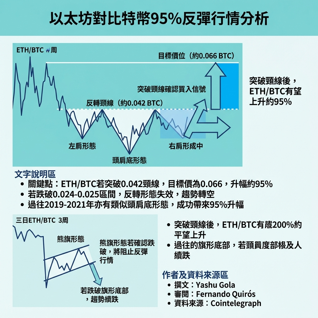 根據技術分析,該形態的目標價通常是從頭部最低點到頸線的距離,向上延伸至突破點之上。若ETH/BTC能突破約0.042 BTC的頸線阻力,目標價將達到0.066 BTC,較現價約有95%的潛在漲幅。