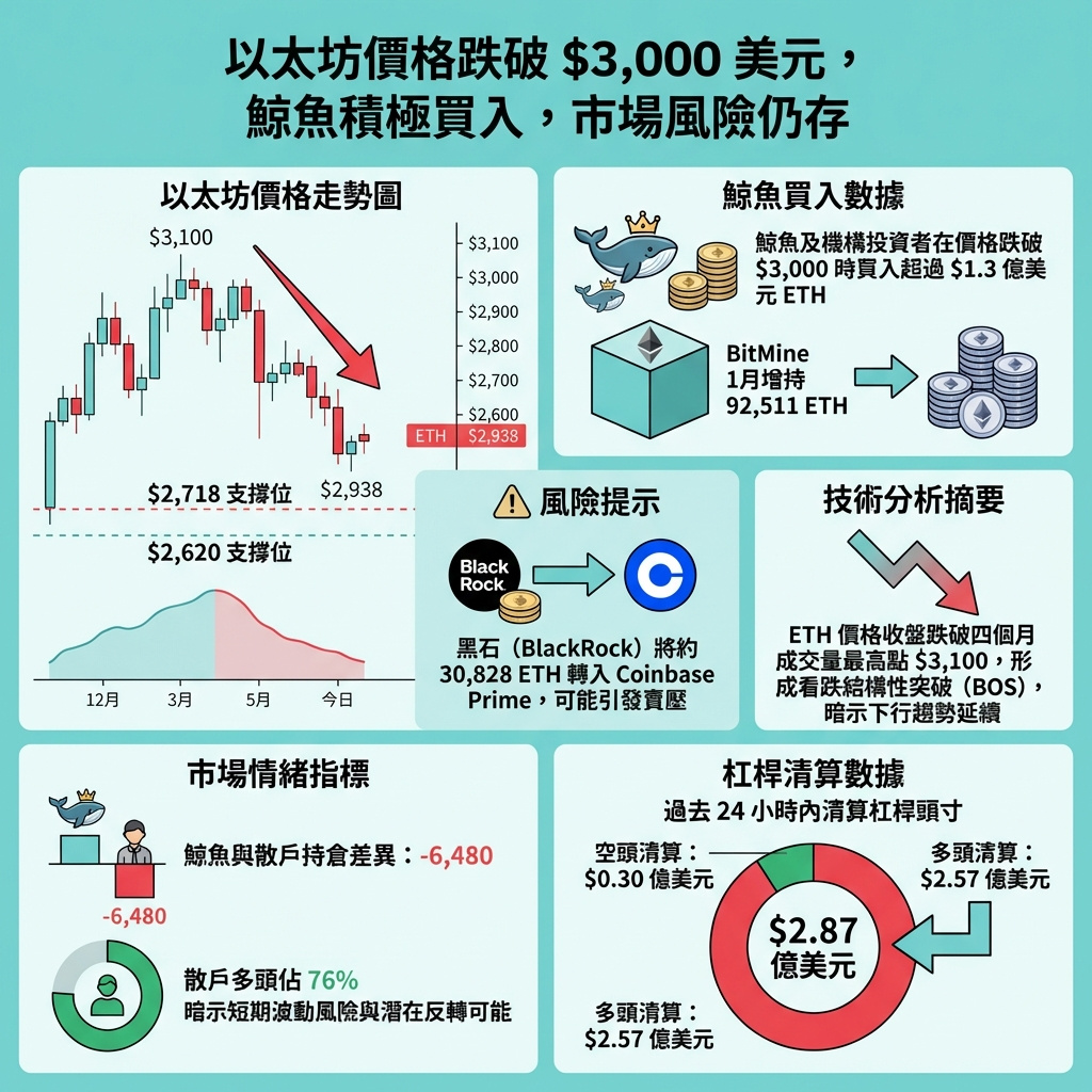 以太坊(ETH)價格週二收市跌穿3,000美元,不過數據顯示大型持有者趁低位買入。雖然ETH大戶的累積動作反映信心增強,但市場仍有指標暗示可能出現更深層次的拋售,價格或進一步下探至2,700美元。