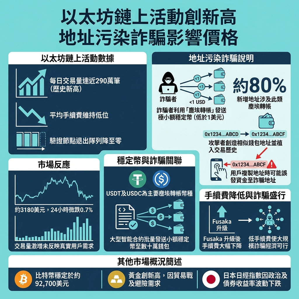 最新數據顯示,以太坊近期交易量激增,主要源自一種名為「地址污染」的詐騙手法,這種手法利用廉價的「塵埃」轉帳來污染交易記錄,並非真正用戶需求所致。