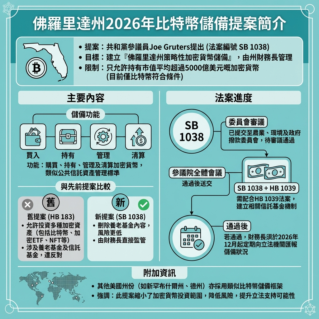 佛羅里達州立法機關正推動一項提案,允許州政府建立戰略性加密貨幣儲備,但將原先較廣泛的計劃收窄至只限持有比特幣。這項名為參議院法案(SB)1038的提案,由共和黨參議員Joe Gruters於去年12月30日提交,目前已被轉交至農業、環境及一般政府撥款委員會審議,需通過聽證和投票後才能送交參議院大會討論。