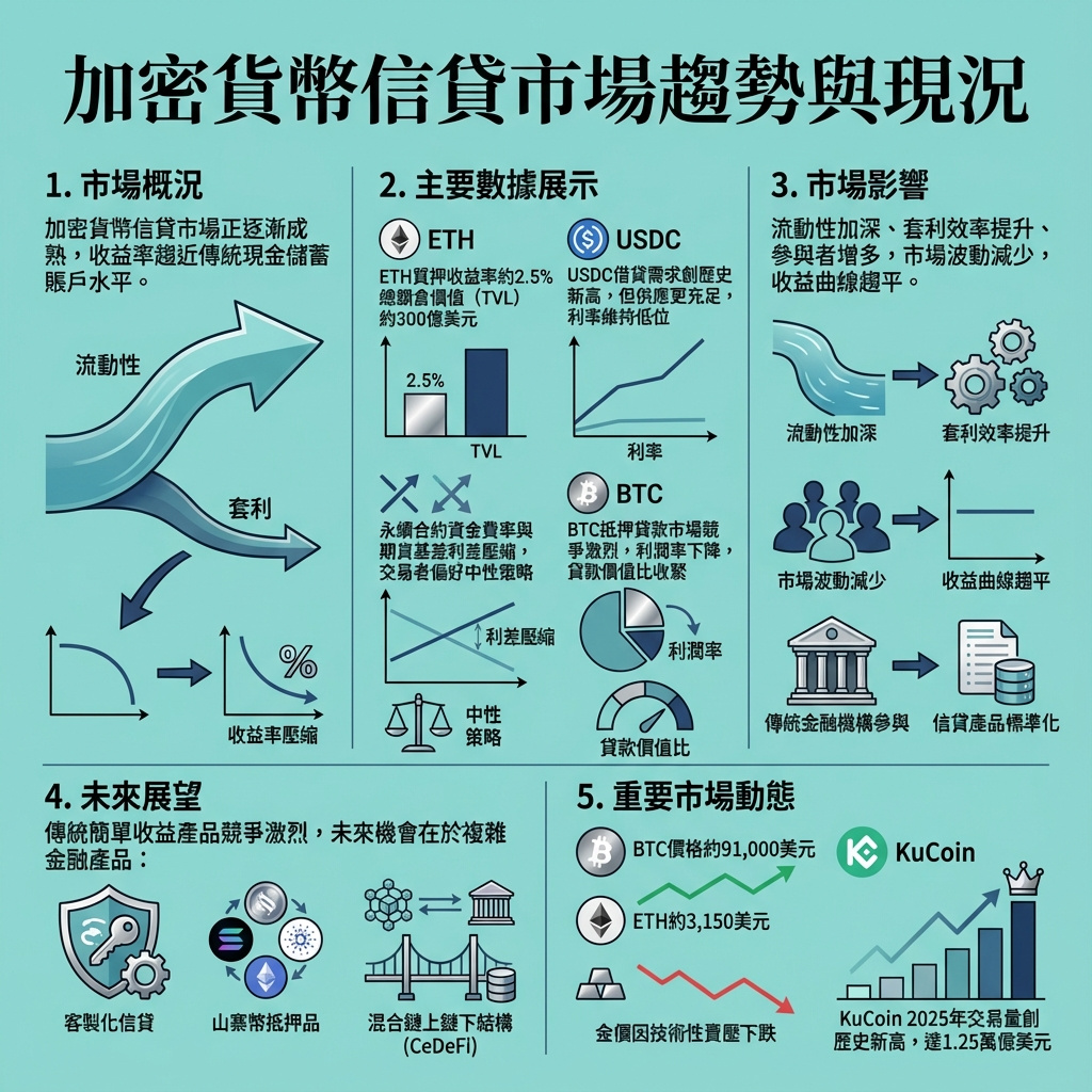 在2025年加密信貸回顧報告中,Flowdesk指出,質押、穩定幣借貸及比特幣抵押信貸的收益率普遍下降,並非因需求不足,而是因流動性加深及套利空間縮小所致。隨著鏈上貨幣市場、衍生品資金費率及期貨基差交易的參與者增加,市場波動性降低,收益曲線趨平,儘管使用量創新高。