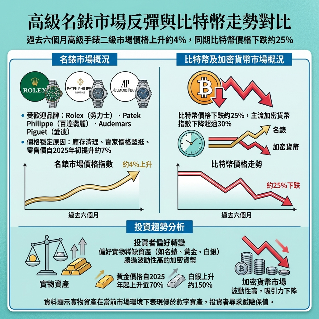 近六個月來,二手高級手錶價格上升約4%,儘管加密貨幣市場下滑,黃金和白銀則吸納了宏觀經濟壓力。