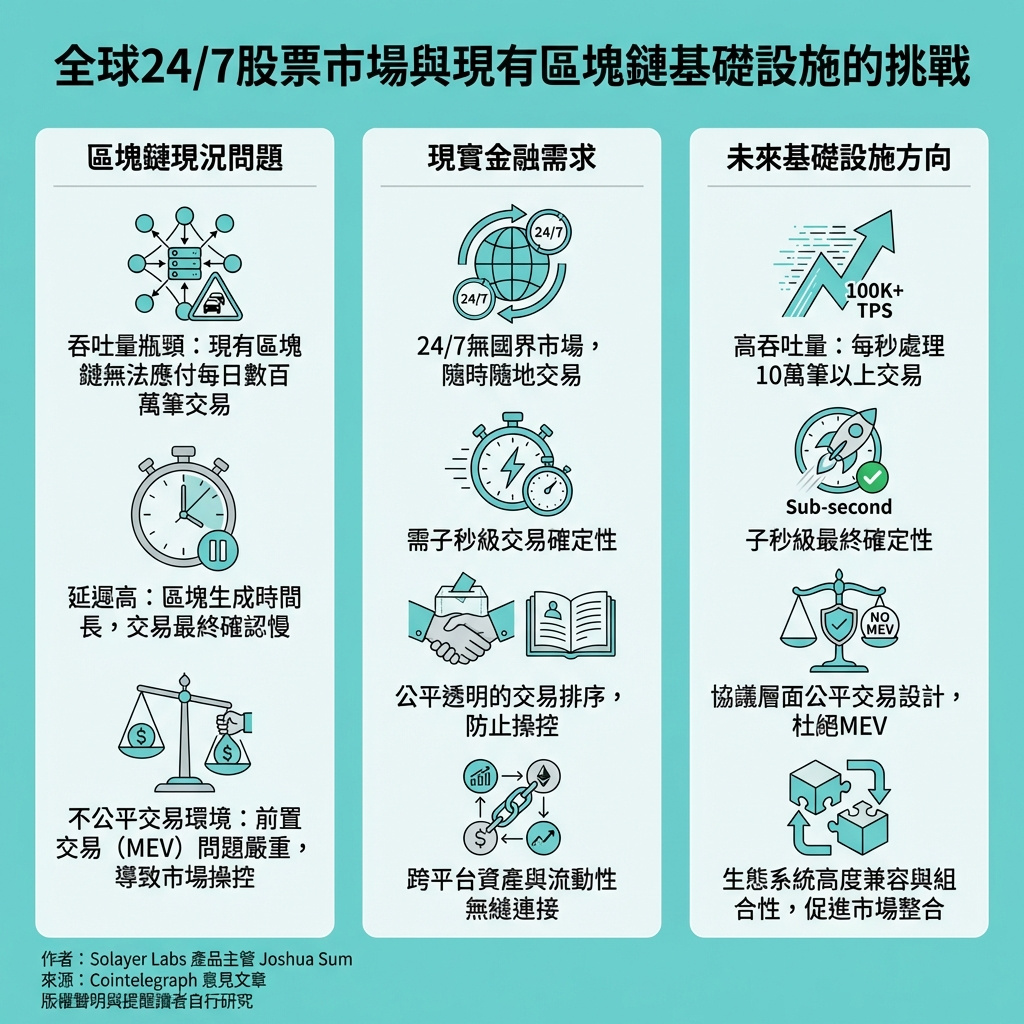 這篇文章深刻點出了區塊鏈技術在推動全球金融市場代幣化過程中,現有基礎設施的嚴重不足。作者不僅揭示了吞吐量、延遲和公平性三大核心問題,更剖析了這些技術短板如何直接影響機構投資者的信心與資金流入,甚至令散戶市場失去公平競爭環境。