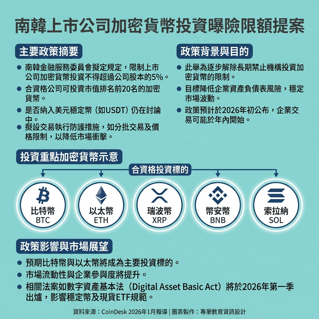 南韓金融服務委員會(FSC)正考慮制定新規定,將上市公司在加密貨幣的投資額度限制在公司股本的5%以內,這是南韓逐步放寬對機構投資者加密貨幣交易限制的重要一步。