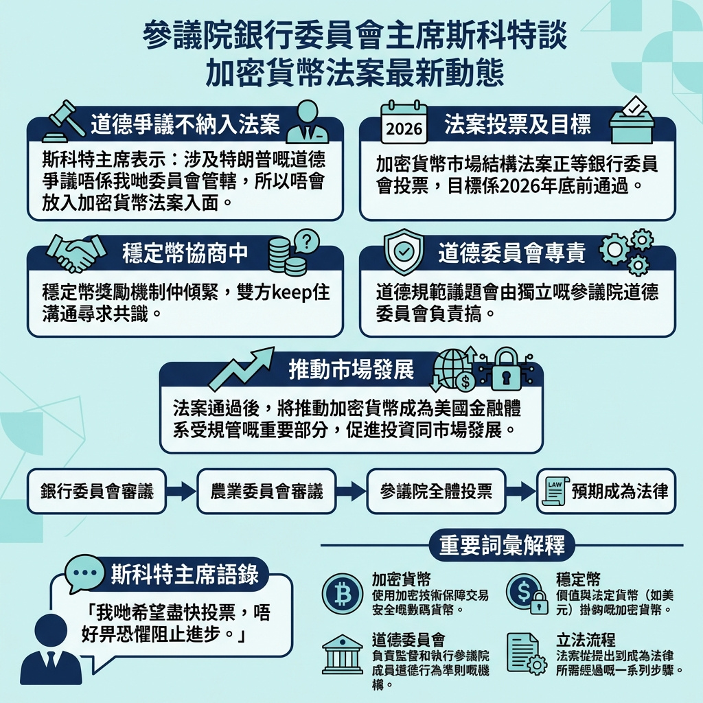 這部被視為加密貨幣行業最重要立法目標的市場結構法案,經過多年政治遊說和數以億計美元的投入,終於接近參議院首次重大投票。斯科特希望在今年底前完成立法,使數字資產市場明確納入美國金融體系的監管框架,為加密貨幣行業帶來合法性和投資熱潮。