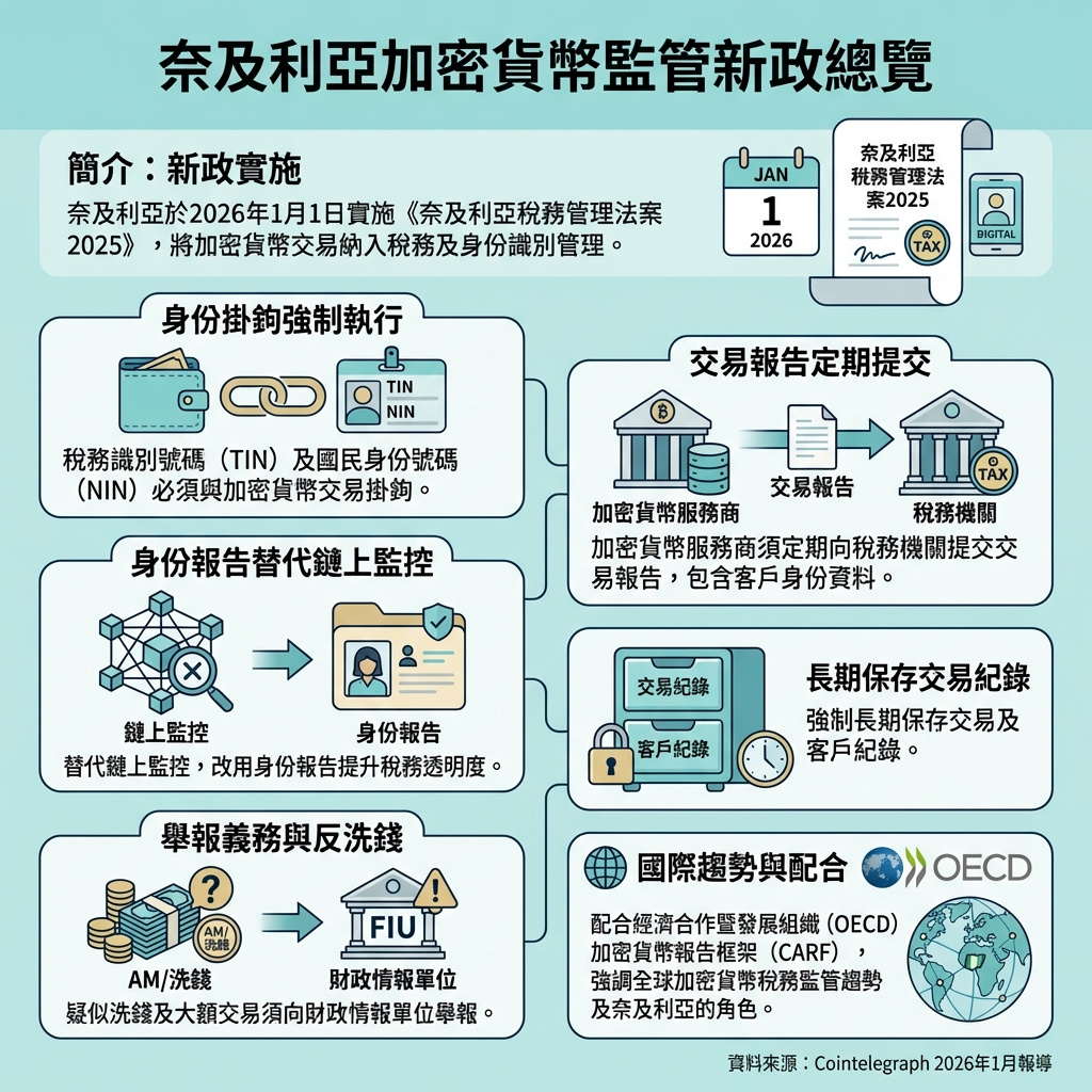 奈及利亞正推出一套全新加密貨幣監管模式,將重點放在稅務和身份系統,而非傳統的區塊鏈監察,這是其大規模稅務制度改革的一部分。