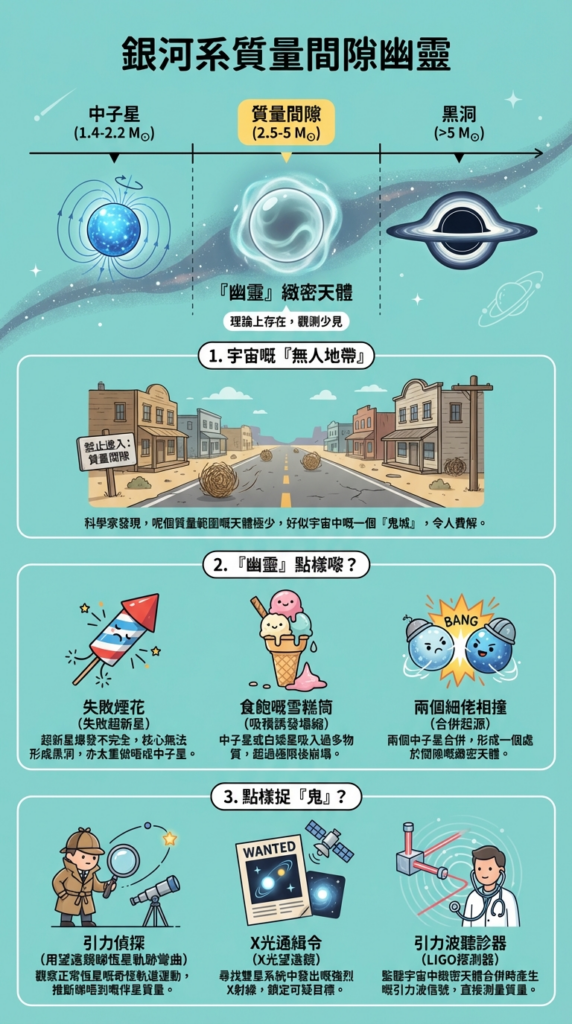 銀河系中嘅「質量間隙幽靈」可能係我們從未見過嘅神秘天體,喺2.5到5倍太陽質量嘅「無人地帶」中潛伏,挑戰我們對宇宙嘅認知!