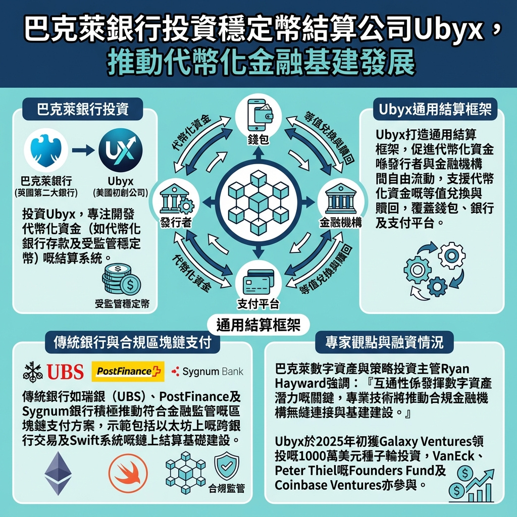 英國第二大銀行巴克萊(Barclays)宣布投資美國初創公司Ubyx,該公司專注開發代幣化貨幣的清算系統,包括代幣化銀行存款及受監管的穩定幣。這項投資雖未公開具體金額,但反映傳統銀行對於建立符合現有金融監管的區塊鏈支付基礎設施興趣日增。