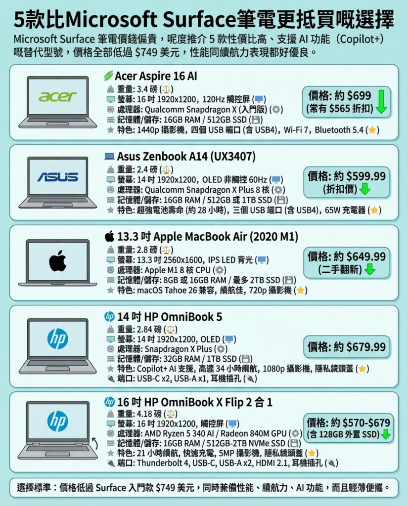 這篇報道清楚展示了Surface Laptop雖然在設計和功能上具備優勢,但其定價對一般用戶來說仍然偏高。現在市場上有多款搭載高通Snapdragon處理器的Windows筆電,不但能提供類似的AI功能和長效電池續航,價格卻更親民。尤其是Acer Aspire 16 AI和HP OmniBook系列,不僅硬件配置不輸Surface,甚至在記憶體和存儲空間上更具競爭力。