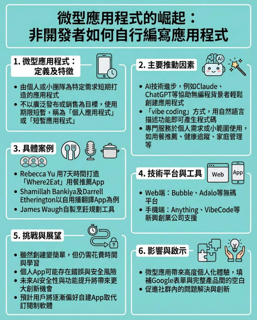 總括而言,微型App的崛起不僅是技術進步的結果,更是人類創造力與個性化需求的自然流露。未來,隨著AI和工具鏈的完善,我們將見證一波又一波的「人人都是開發者」浪潮,軟件世界將變得更加多元、活躍和貼心。