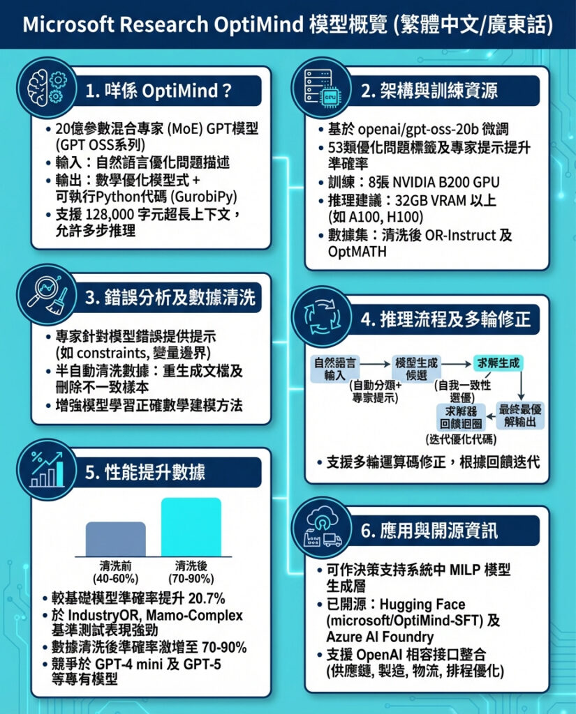 1. OptiMind是一款20億參數的混合專家Transformer GPT OSS家族模型,輸入自然語言優化問題,輸出數學模型及可執行的GurobiPy程式碼,每詞元啟用約36億參數,上下文長度高達128,000詞元。