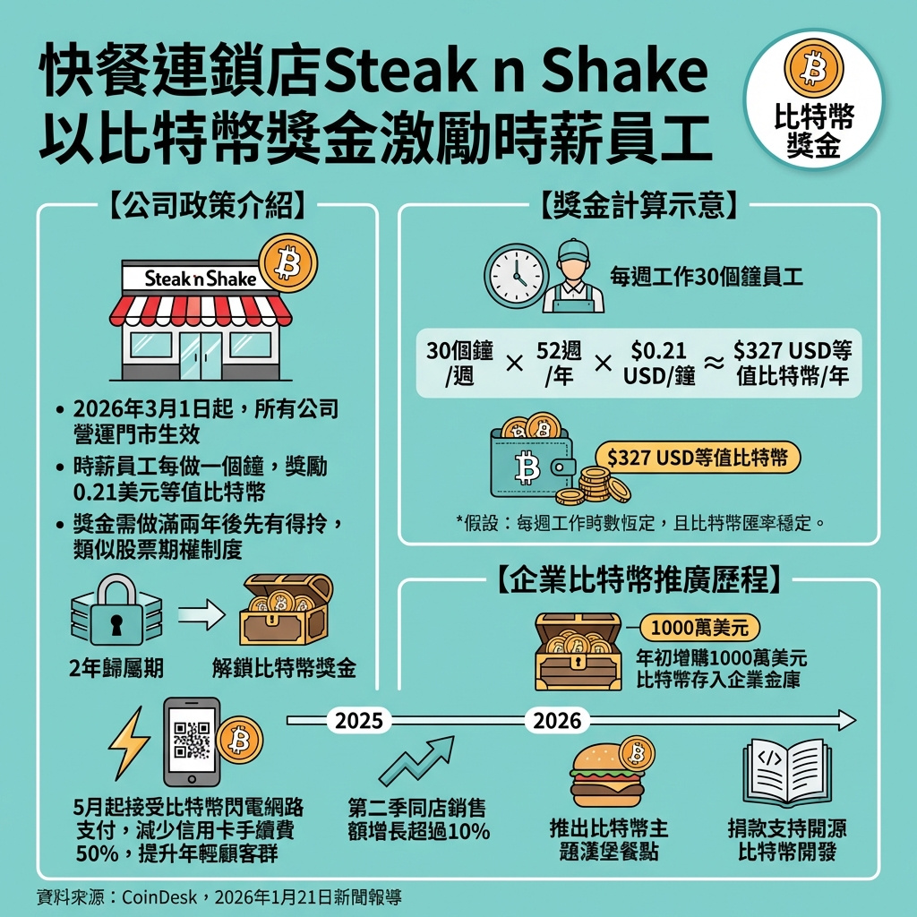 這項獎金計劃是Steak n Shake自2025年5月起全面推動比特幣支付的延伸。當時公司開始在全美門店接受比特幣閃電網絡支付,這不僅是市場推廣策略,根據公司營運長Dan Edwards透露,比特幣支付幫助公司削減一半的信用卡手續費,並吸引了更多年輕消費者,令同店銷售額在2025年第二季度增長超過10%。