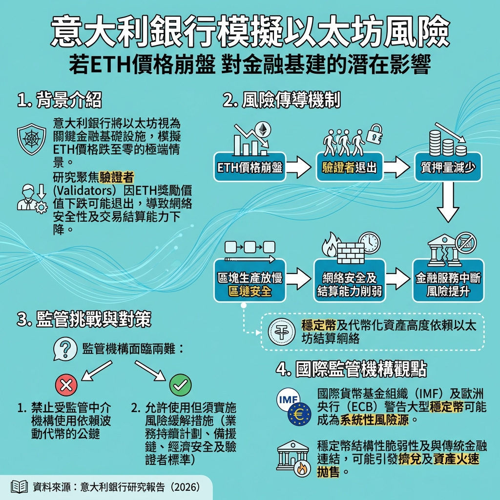 意大利銀行近日對以太坊(Ethereum)原生代幣以太幣(Ether,ETH)價格若跌至零的極端情況進行模擬,旨在展示以太幣的市場風險如何可能轉化為基礎設施及金融穩定風險。