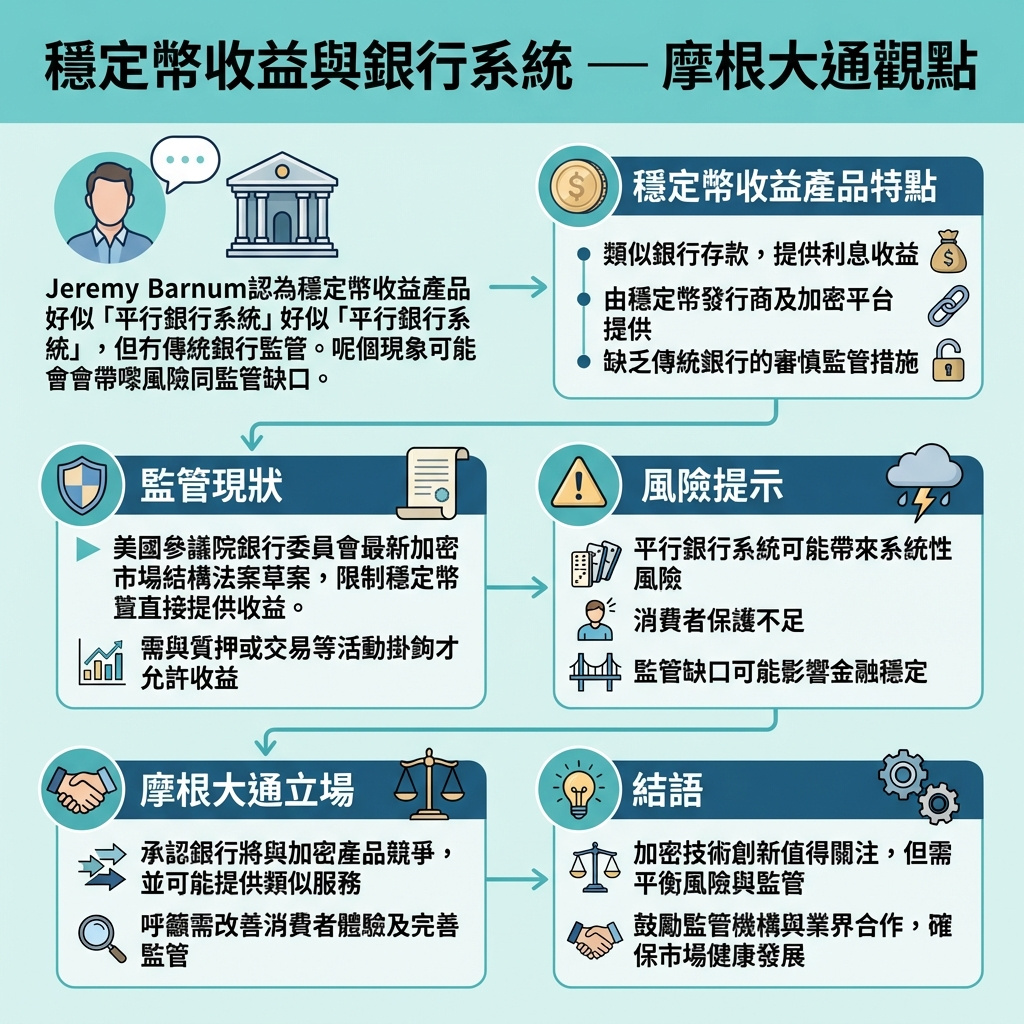 摩根大通(JPMorgan)財務總監Jeremy Barnum於近日財報電話會議上表示,雖然該行會與加密貨幣產品競爭,但他警告穩定幣收益產品看似銀行業務,卻缺乏相應監管,形容這種現象猶如建立了一個「平行銀行系統」。