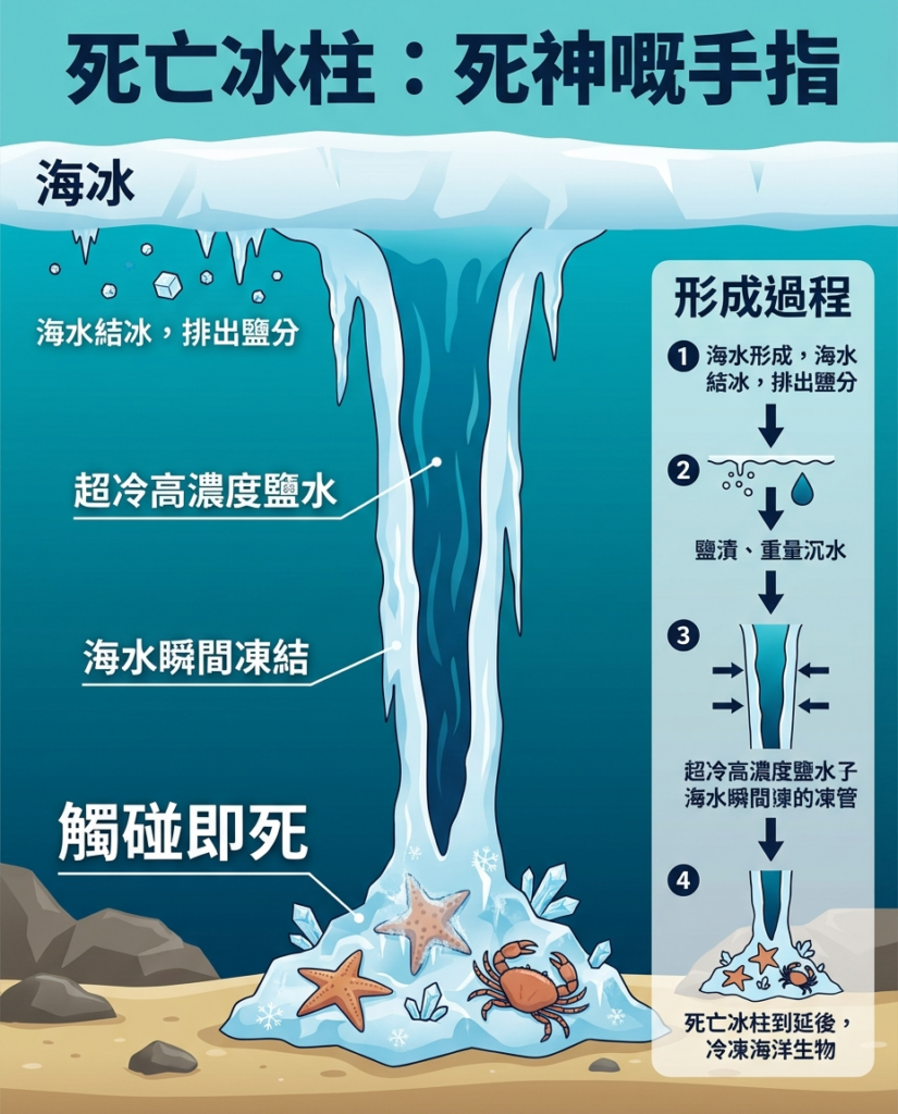 喺南極嘅冰下,有一種好似死神手指嘅「死亡冰柱」,所到之處,所有海洋生物都會即時結冰死亡。