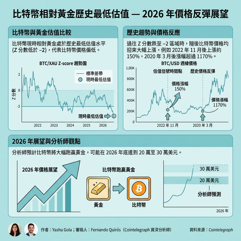 比特幣(BTC)於週五出現自歷史以來最嚴重的相對黃金(XAU)低估狀況,令市場重新燃起2026年資金可能從黃金轉向加密貨幣市場的憧憬。