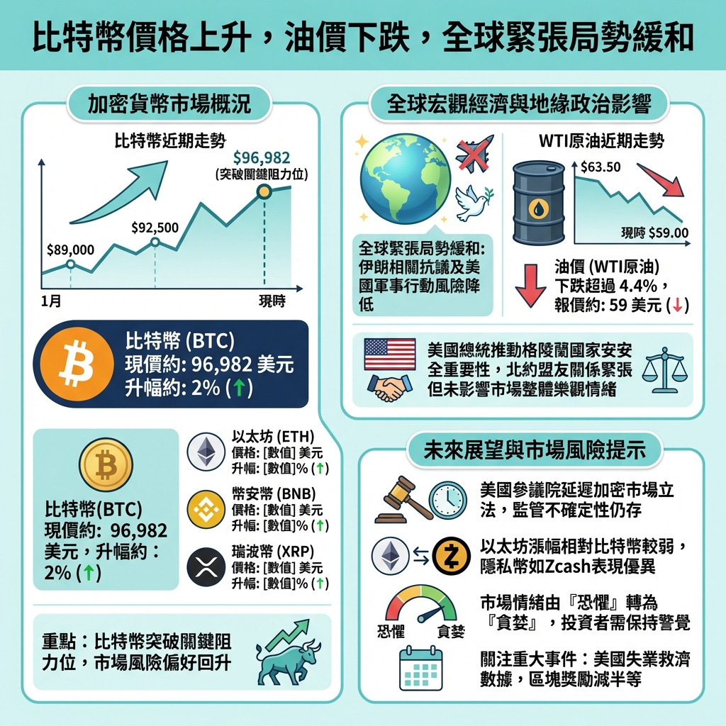2026年1月15日,全球市場出現明顯波動,比特幣價格在過去24小時內上漲近2%,突破了持續兩個月的97,000美元關口,顯示投資者風險偏好回升。與此同時,油價因全球地緣政治緊張情況緩和而大幅下跌,WTI原油期貨一度下跌超過4.4%,報59美元左右。