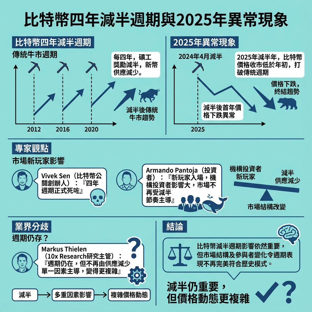 比特幣的四年減半週期長期以來被視為市場走勢的「聖經」,不過隨著市場參與者結構的深刻變化,這一規律正面臨前所未有的挑戰。機構投資者和大型資產管理者的加入,帶來了更成熟和宏觀的交易邏輯,令比特幣價格不再單純依賴供應端的變化,而是受全球經濟環境、政策監管及地緣政治影響更大。
