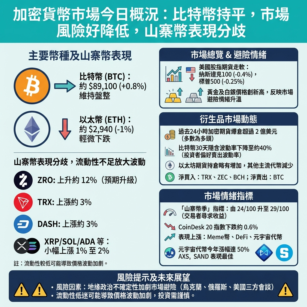 黃金及白銀價格創新高,顯示投資者因地緣政治不確定性而加碼防禦性資產。山寨幣方面,LayerZero的ZRO代幣因預期2月初將有重大升級,過去24小時內上漲12%,TRX及DASH亦分別上升約3%。不過,整體市場流動性偏低,可能放大價格波動。