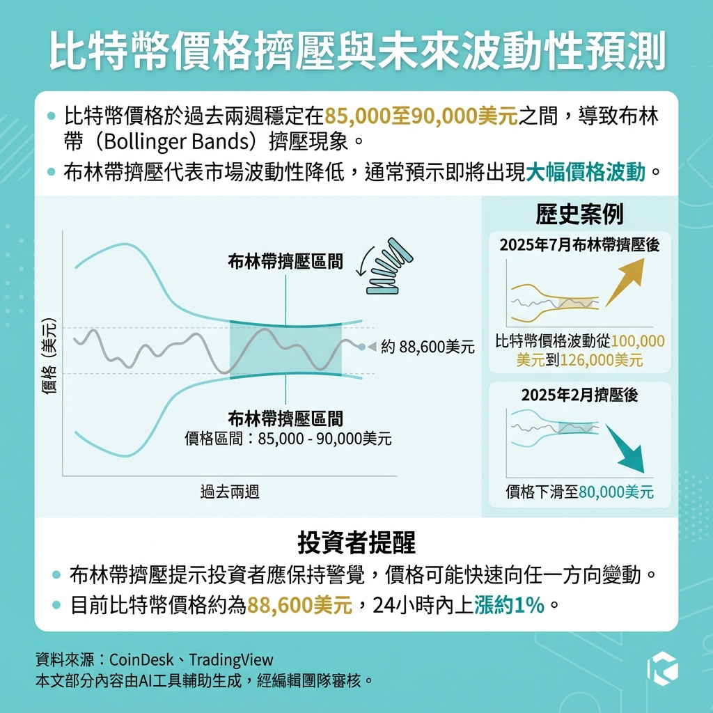 自2018年起,波林格帶已多次準確預示比特幣的波動爆發。因此,現時的波動收窄提醒交易者保持警覺,價格很可能會在短期內向任一方向快速移動。截至發稿時,比特幣報約88,600美元,24小時內上升逾1%。