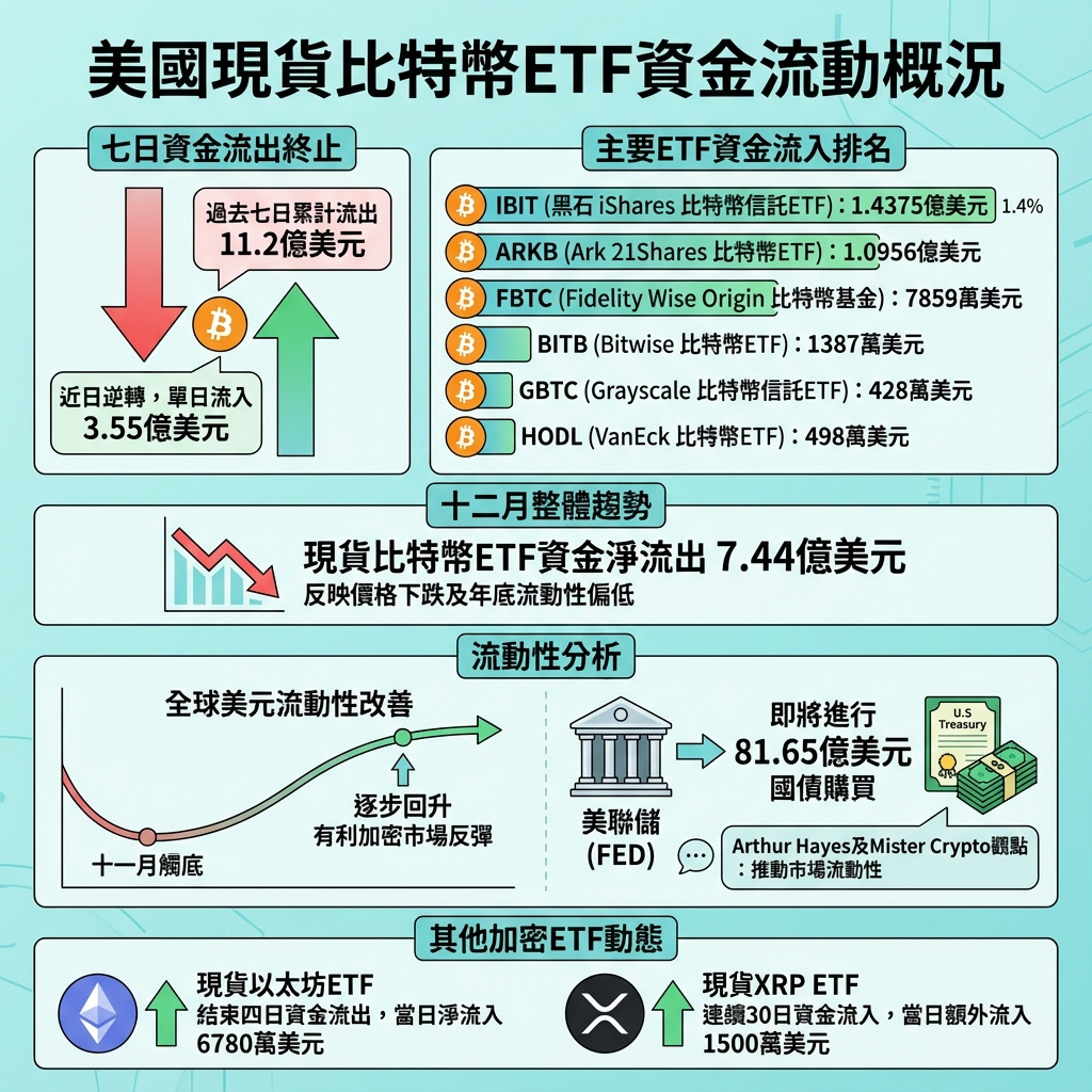 美國現貨比特幣交易所買賣基金(ETF)終止了連續七天的淨資金流出,當日吸納了3.55億美元資金,反映交易者開始看到全球流動性改善的初步跡象。