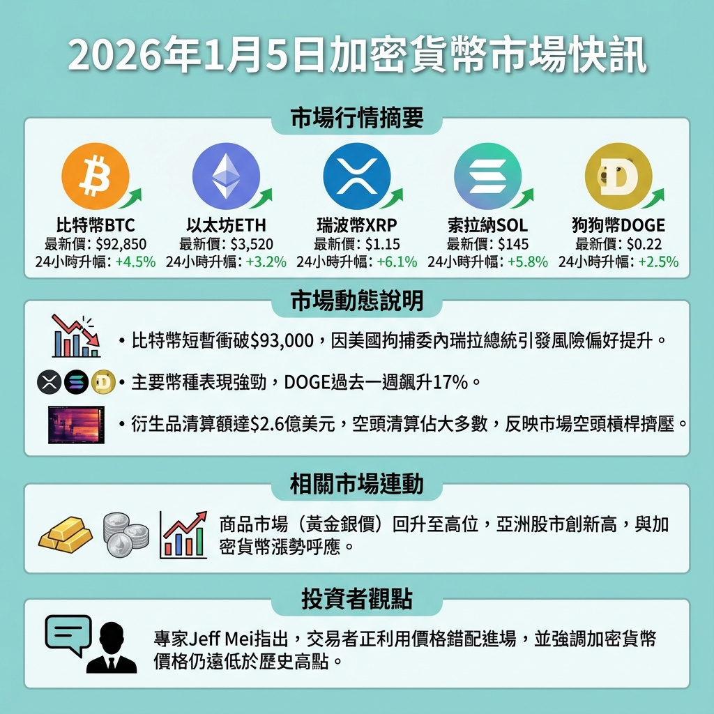 隨著美國成功驅逐委內瑞拉總統,市場風險偏好提升,加密貨幣市場延續新年以來的漲勢,與此同時,商品和亞洲股市也因人工智能帶動的動能及地緣政治發展而同步上揚。
