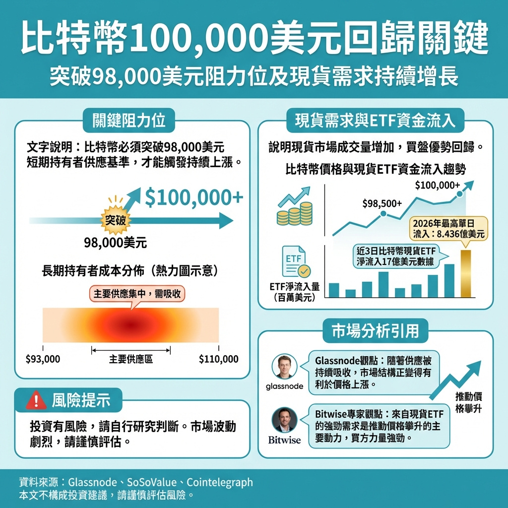 比特幣重返10萬美元關鍵:突破98,000美元阻力及現貨需求回升