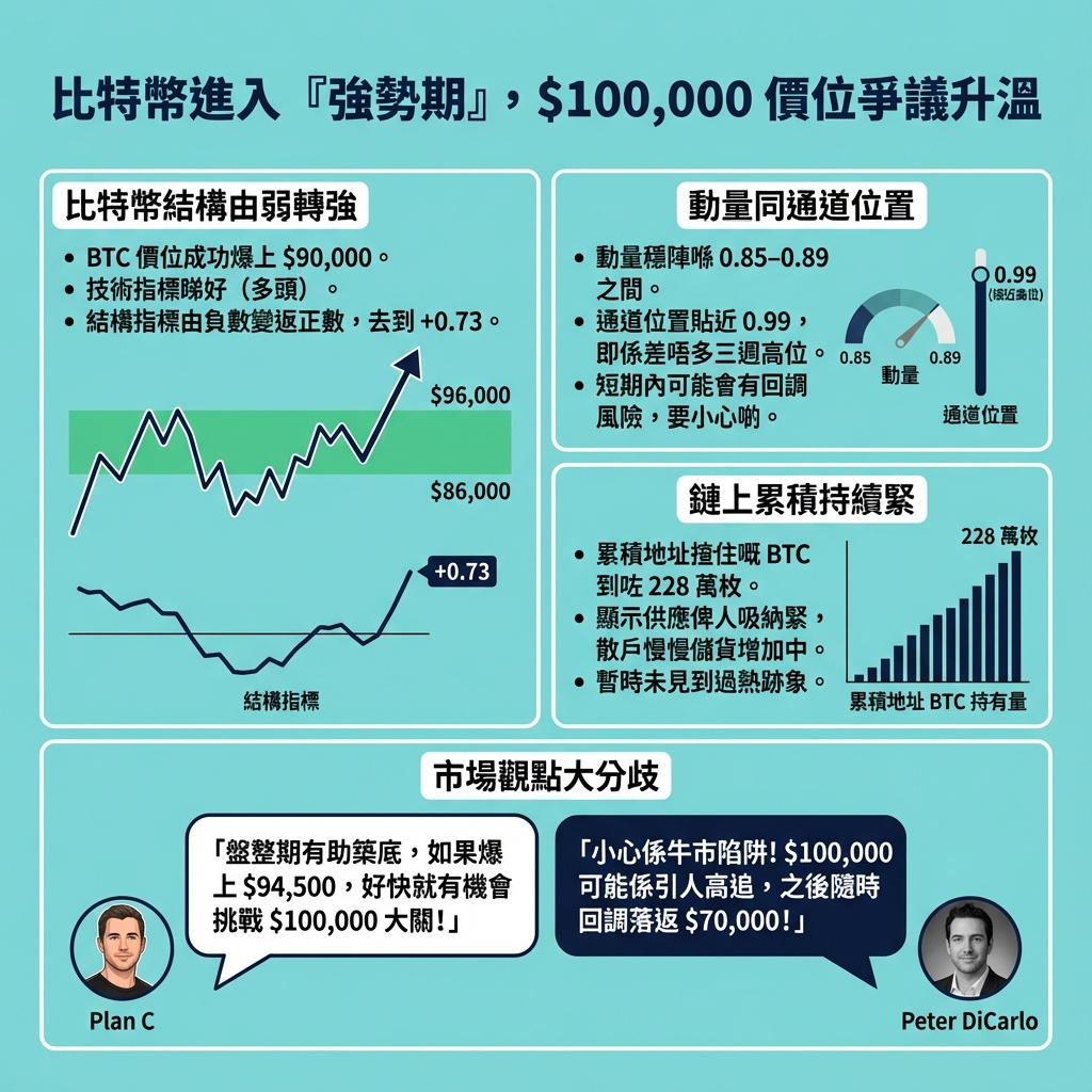 這篇報導精準捕捉了比特幣近期技術面與市場情緒的雙重矛盾。從技術指標來看,BTC似乎已經進入一個強勢階段,動能和通道位置均支持價格繼續上行,且鏈上累積數據顯示長線持有者仍在積極收集。然而,市場的分歧反映了投資者對牛市持續性的懷疑,尤其是10萬美元這個心理關口,既是目標也是潛在的陷阱。