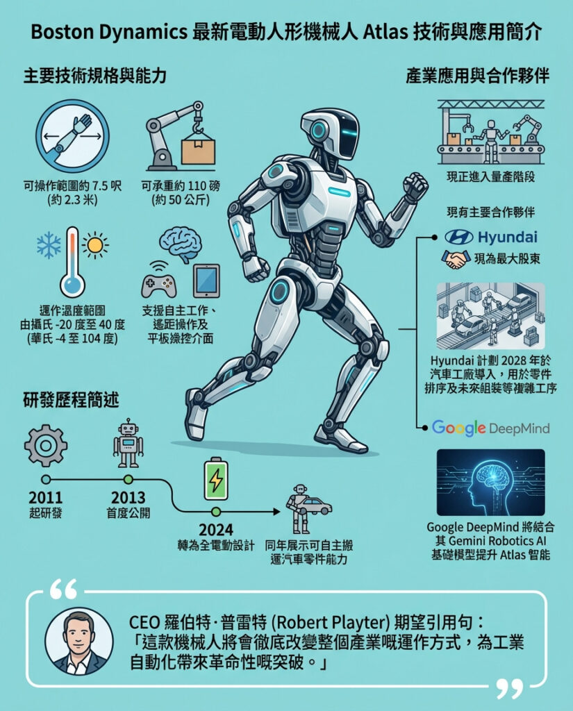 現代汽車計劃於2028年在汽車工廠引入Atlas,主要負責零件排序工作,並期望到2030年能擴展至零件組裝,未來更會承擔重複動作、搬運重物及其他複雜任務。另一方面,Google DeepMind則會利用Atlas機械人,將其人工智能基礎模型Gemini Robotics整合進Boston Dynamics的機械人系統中。