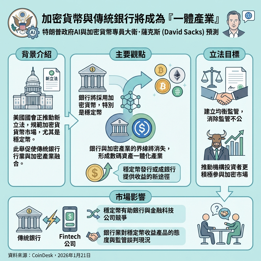 白宮加密貨幣及人工智能顧問大衛·薩克斯(David Sacks)預測,美國銀行最終會採用加密貨幣,特別是穩定幣,隨著新立法重塑行業監管格局,銀行與加密貨幣行業之間的界線將逐漸消失。