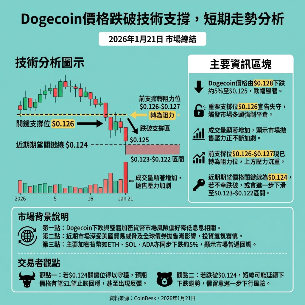 根據CoinDesk數據顯示,狗狗幣(DOGE)近日價格跌破關鍵支撐區約0.126美元,隨即引發多頭平倉潮,導致價格約下跌5%。此次跌破伴隨著交易量顯著增加,原本的支撐位0.126至0.127美元現已轉為阻力位,任何反彈均受阻。交易員普遍認為0.124美元是短期的「防線」,若此價位失守,狗狗幣可能會進一步下滑至0.123至0.122美元。