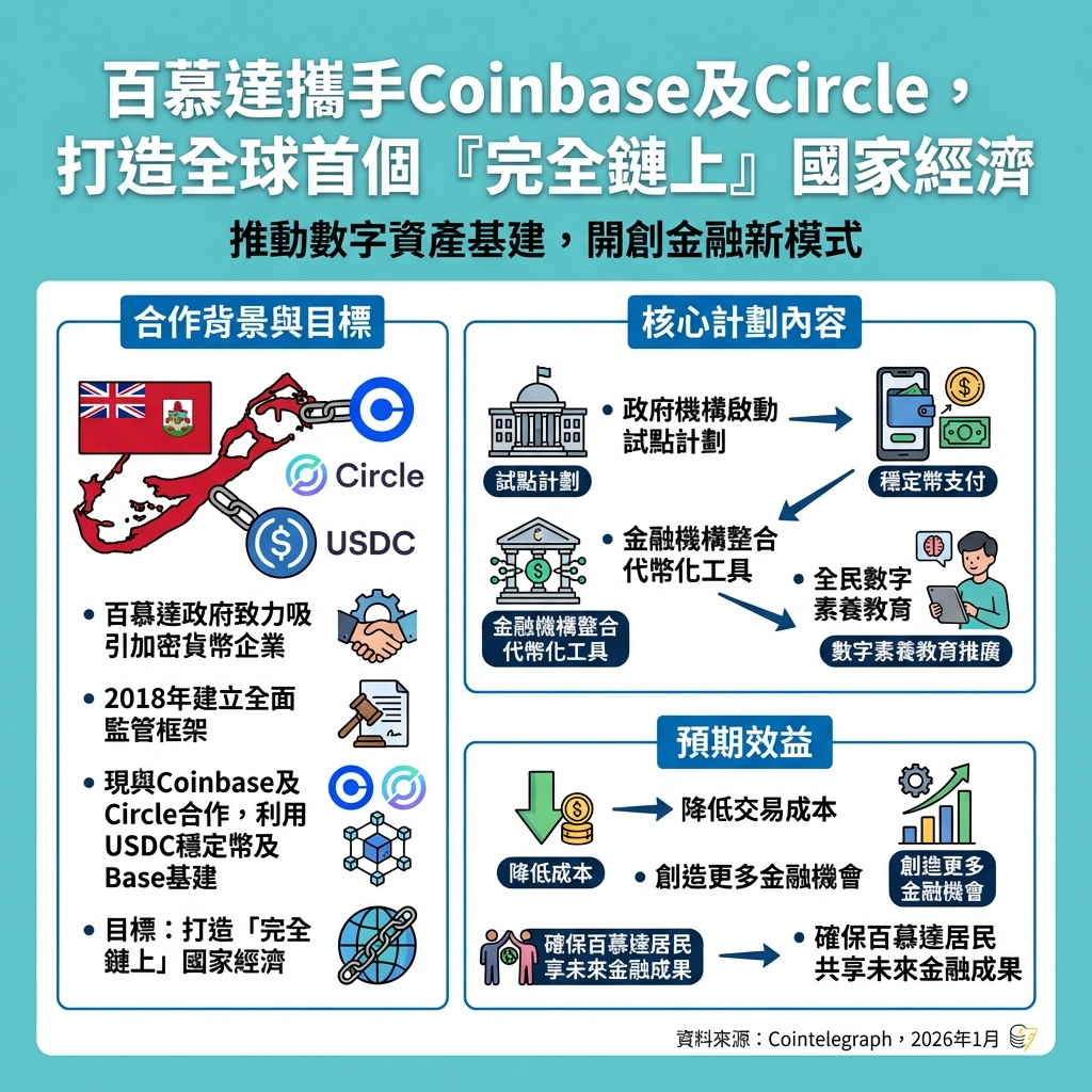 百慕達政府計劃利用加密貨幣交易所Coinbase及穩定幣發行商Circle提供的數字資產基建,打造一個「全面鏈上」的國家經濟體系。