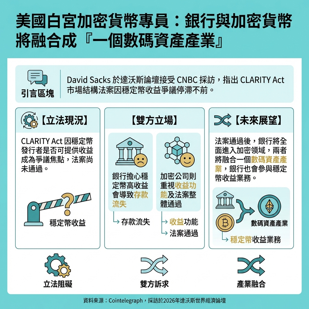 美國白宮加密貨幣專員David Sacks於世界經濟論壇(WEF)在瑞士達沃斯接受CNBC《Squawk Box》訪問時表示,一旦國會通過長期拖延的市場結構法案,銀行與加密貨幣公司最終將融合成「一個數碼資產行業」。