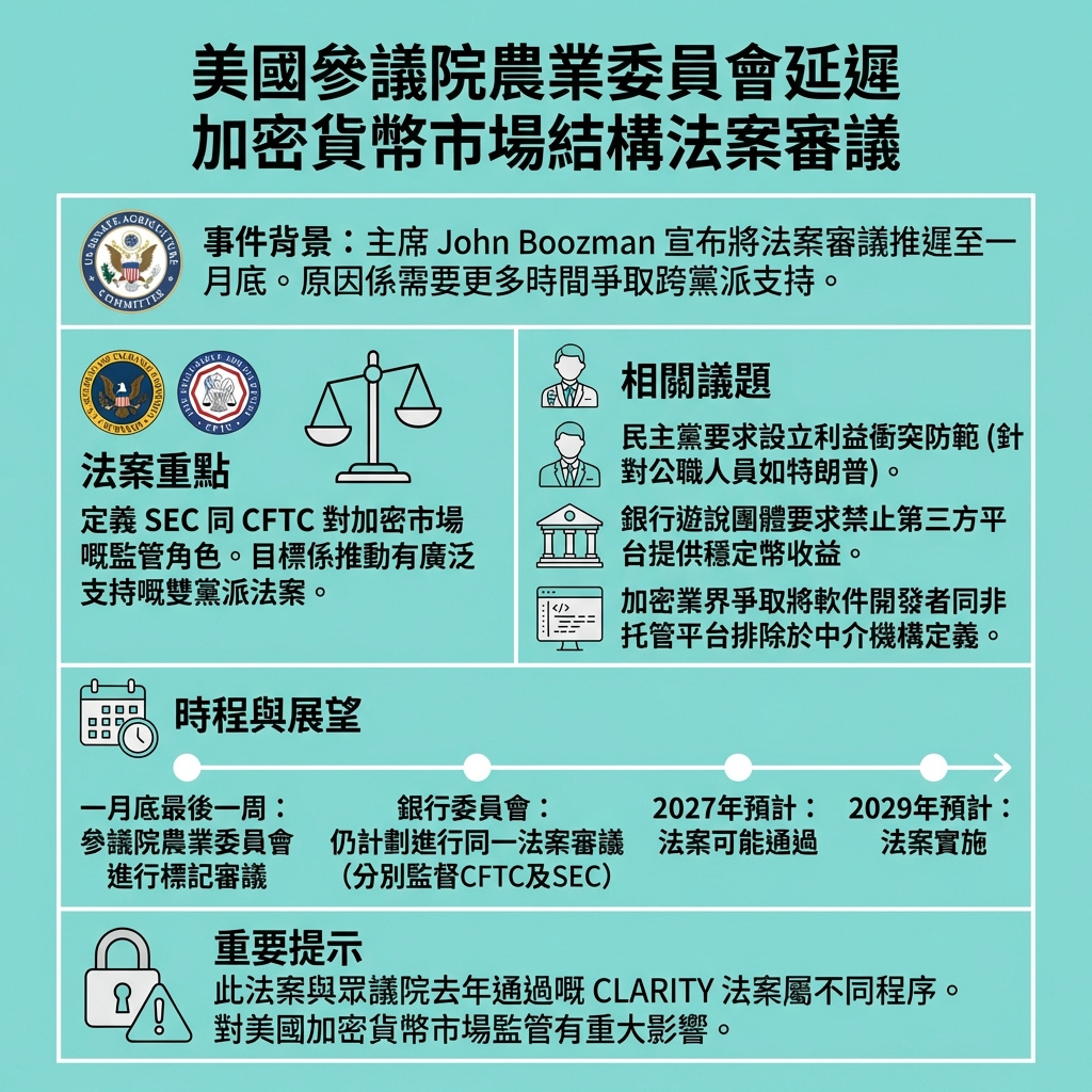 美國參議院農業委員會主席約翰·布茲曼(John Boozman)宣布,將推遲對加密貨幣市場結構法案的審議,延至一月底,以爭取更多跨黨派支持。