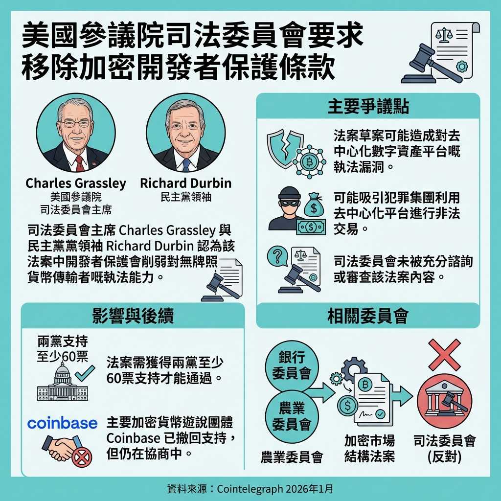 美國參議院司法委員會的共和黨和民主黨領袖近日呼籲修改正在審議的加密貨幣市場結構法案,認為其中的開發者保護條款會削弱對未持牌資金轉移業務的監管力度。