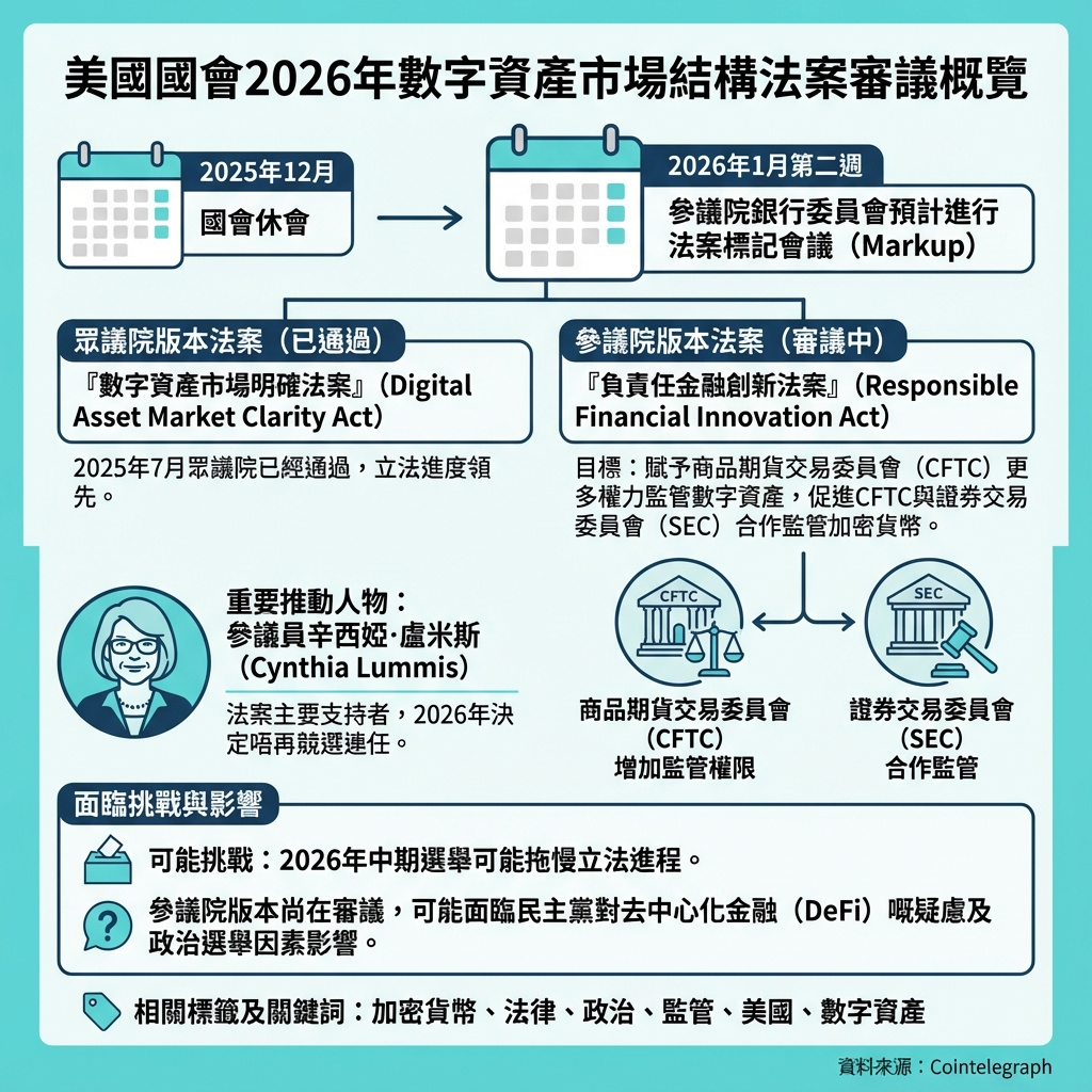 隨著國會休會至新年,有消息指熟悉數碼資產市場結構法案進展的人士預計,相關法案將於2026年初獲得審議。