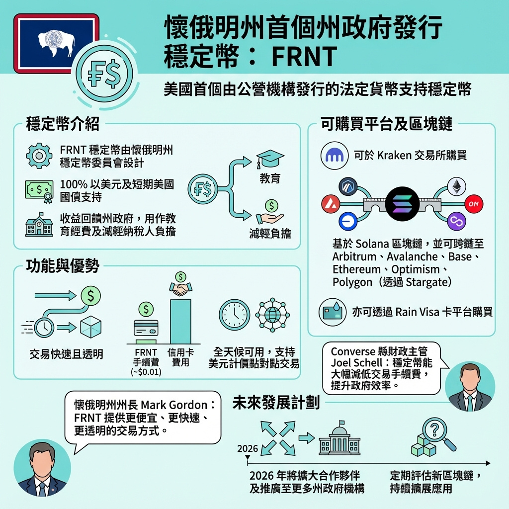 懷俄明州穩定幣委員會計劃於2026年持續擴展FRNT的應用,將引入更多轉售合作夥伴,推廣至其他州政府部門,並與有意發行穩定幣的公共機構合作。
