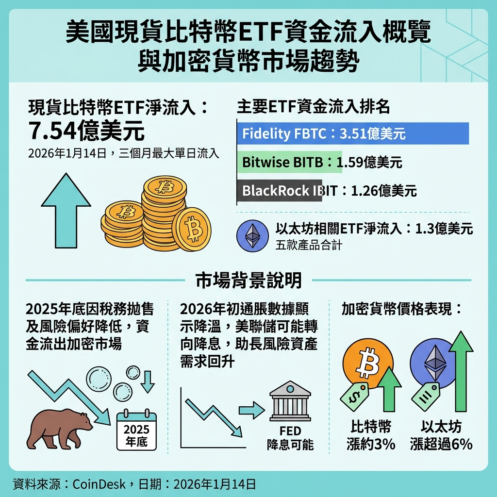 根據最新數據顯示,美國現貨比特幣交易所買賣基金(ETF)於本週二錄得三個月以來最大單日資金淨流入,達7.537億美元,反映機構投資者在年終調整後重新進場,風險資產需求回升。