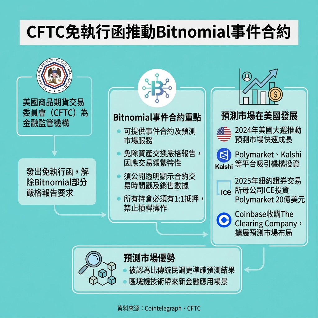 美國金融監管機構商品期貨交易委員會(CFTC)於星期四向加密衍生品交易所Bitnomial發出無執法行動(no-action)信,允許該交易所推出事件合約及預測市場。這封信解除Bitnomial在現行美國規則下,對資產交換的嚴格報告要求,這對於像預測市場這類快速交易平台而言,原本是非常不切實際的障礙,因為這類市場每日可能有成千上萬的交換交易發生。