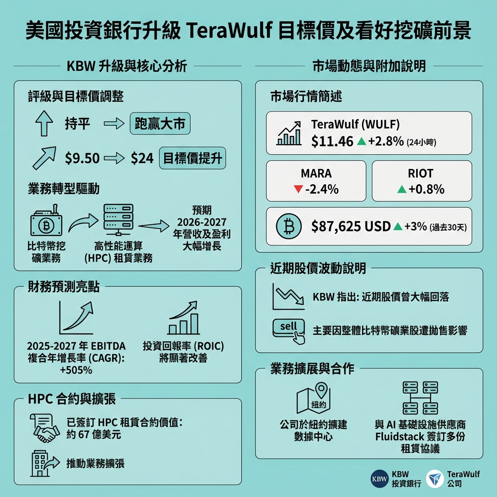 美國著名投資銀行Keefe, Bruyette & Woods(KBW)近日對比特幣礦業公司TeraWulf的評級由「持平」升至「跑贏大市」,並將其目標股價由9.5美元大幅調升至24美元,主要基於該公司未來業務結構即將出現重大轉變,市場尚未充分反映這一潛力。