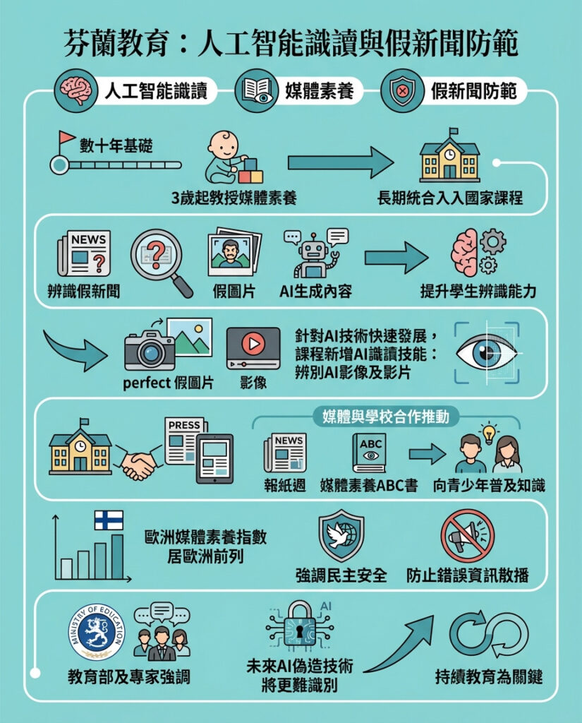 芬蘭多年來將媒體識讀教育從幼兒階段開始做起,並且持續更新課程內容以應對快速變化的資訊環境,這種前瞻性和持續性值得香港借鑒。香港社會近年同樣面對假新聞與錯誤資訊的挑戰,尤其在政治及公共衛生議題上更為嚴重,然而本地媒體素養教育尚未普及到幼童階段,亦缺乏系統性的AI素養課程。