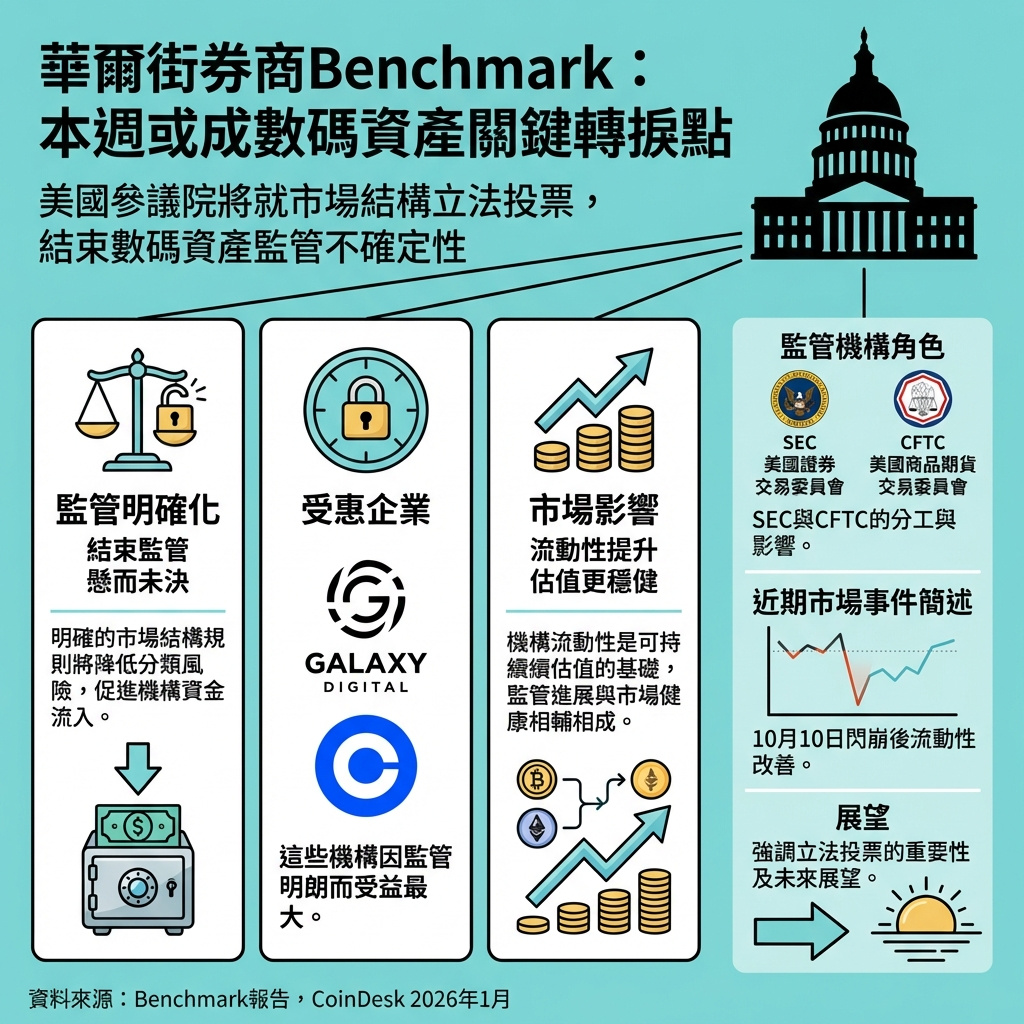 Benchmark強調,從政治辯論轉向立法執行至關重要。制定明確規則能減少未來監管風險,避免若華盛頓目前支持加密貨幣的態度逆轉,導致市場遭遇「監管地毯拉扯」的風險。