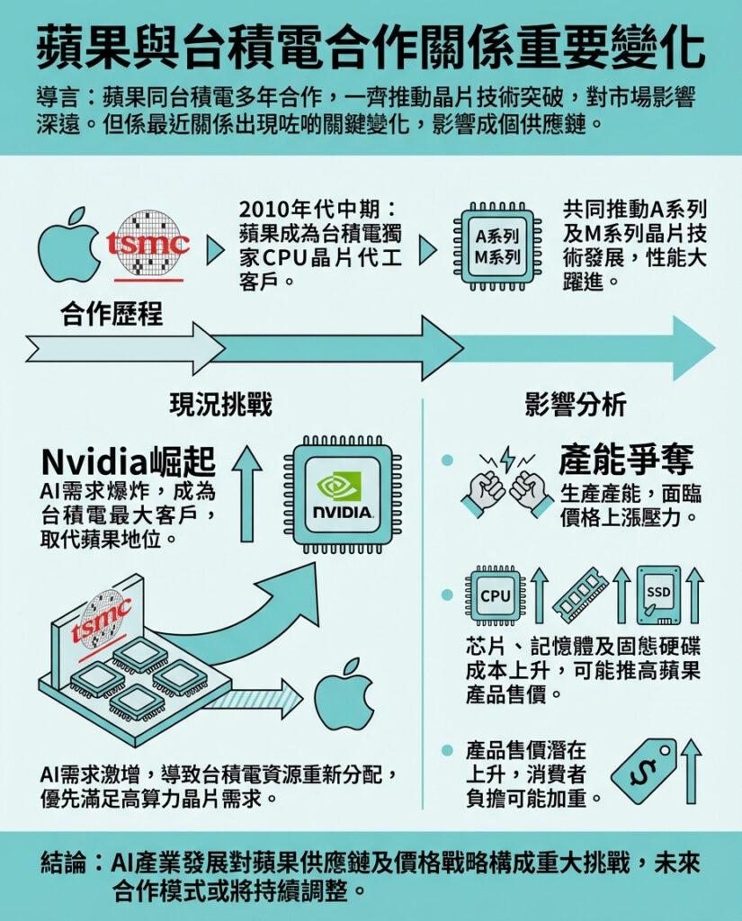 這篇報導反映出AI熱潮正深刻改變半導體產業的供應鏈結構,也突顯蘋果過去憑藉其龐大訂單量取得的優勢正在動搖。台積電作為全球最先進的晶圓代工廠,其產能有限且需求旺盛,尤其是來自AI晶片製造商的壓力巨大,讓蘋果不得不在產能分配上與英偉達等強勁對手爭奪。