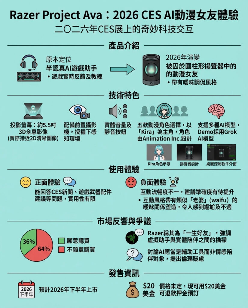 Project Ava未有確實發售日期,Razer計劃喺2026年下半年推出,價錢未定,但你而家可以用20美元訂金(可退款)預訂。