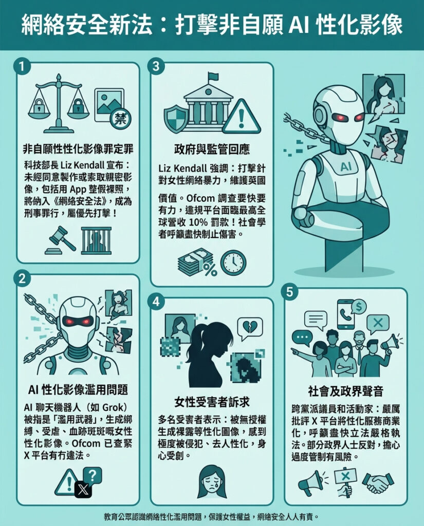 英國科技大臣Liz Kendall向國會議員表示,從本周起,製作非自願性親密影像將被列為刑事罪行。這項規定是基於去年已通過的相關法律,並將作為《網絡安全法》中的「優先罪行」予以實施。此舉正值通訊監管機構Ofcom對社交媒體平台X(前身為Twitter)旗下AI聊天機械人Grok涉嫌製作性化影像展開調查之際。