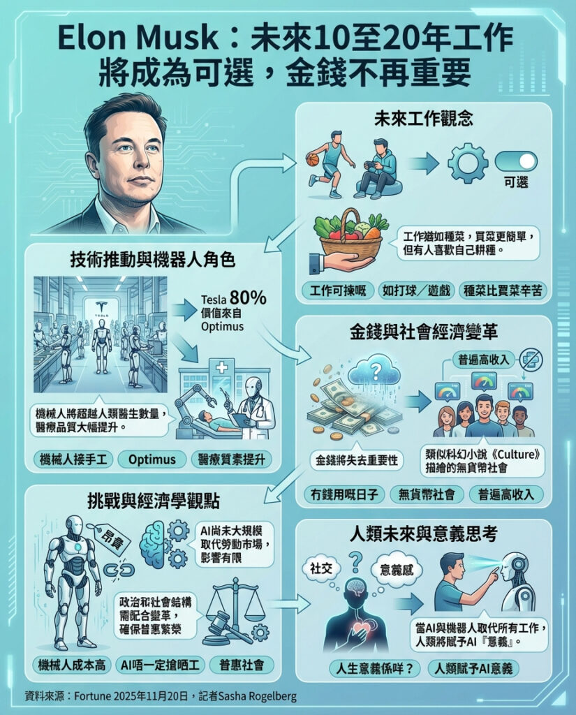 Elon Musk預言10至20年內工作將變成自願,金錢將失去意義,因AI和機械人帶來全新未來