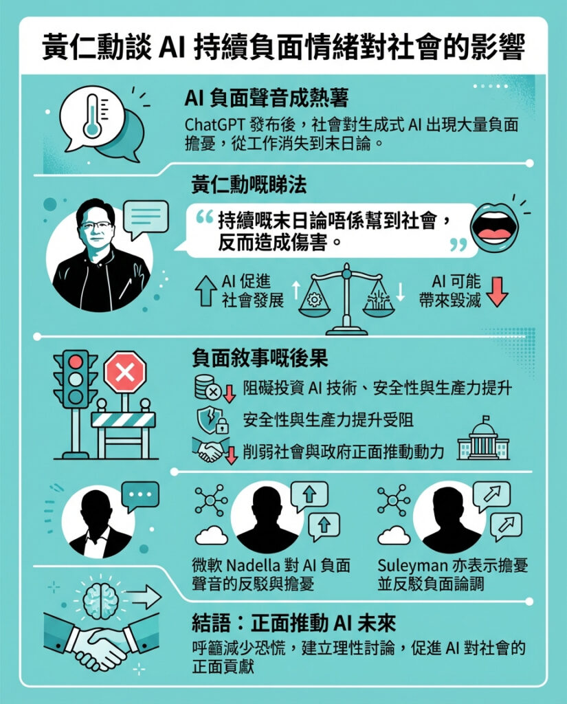 黃仁勳還警告,過度的AI負面情緒可能會讓悲觀者的恐懼成真。