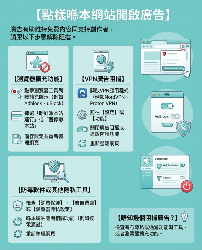 根據你的設備設定,廣告可能被瀏覽器擴充功能、VPN、防毒軟件或其他應用程式屏蔽。以下是一些常見的解決方法: