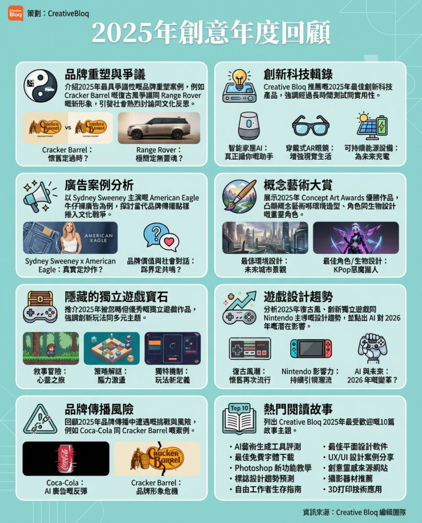 2025年嘅創意領域呈現咗一個多維度嘅發展局面,從品牌設計嘅爭議到科技產品嘅突破,再到遊戲同藝術界嘅多元創新,整體反映咗社會同文化嘅複雜性同變動。尤其值得注意嘅係,品牌同廣告唔再係純粹嘅視覺傳達,而係成為文化對話甚至社會衝突嘅戰場。呢種趨勢提示我哋,創意工作者唔可以淨係關注設計美學,仲要深刻理解社會脈絡同消費者心態。